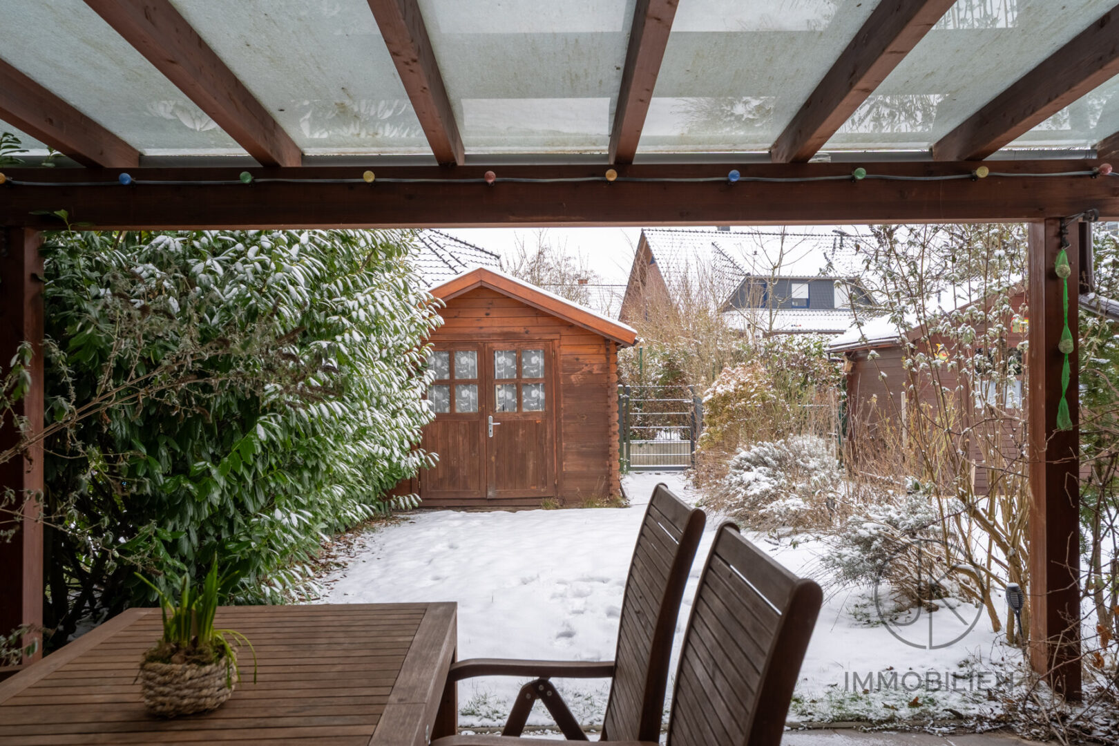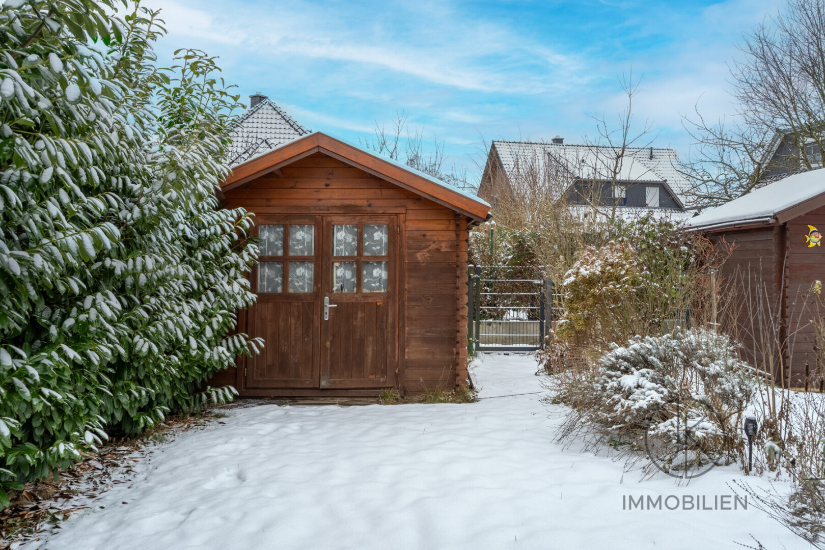Das Grundstück ist pflegeleicht angelegt und bietet neben der Terrasse ausreichend Platz für den Aufenthalt im Freien. Der Garten eignet sich sowohl für entspannte Stunden als auch für die Nutzung mit Kindern. Ein separates Gerätehaus im Garten schafft zusätzlichen Stauraum für Gartengeräte, Fahrräder oder Gartenmöbel. Das Haus ist nicht unterkellert.