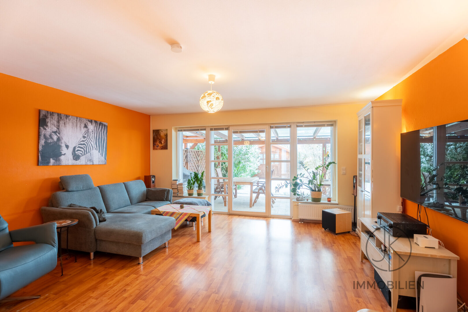 Das Erdgeschoss bildet den Lebensmittelpunkt des Hauses. Der großzügig geschnittene Wohn- und Essbereich bietet ausreichend Platz für Wohnen, Essen und familiäres Zusammensein. Große Fensterflächen sorgen für eine gute Belichtung und schaffen eine angenehme Wohnatmosphäre. Vom Wohnbereich aus besteht direkter Zugang zur überdachten Terrasse sowie zum Garten, wodurch sich der Wohnraum in den wärmeren Monaten sinnvoll nach außen erweitert.