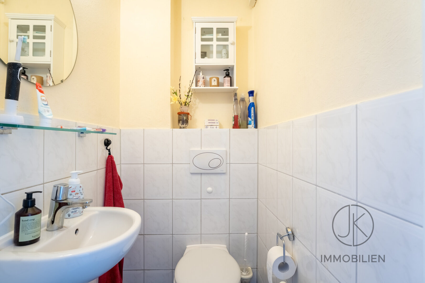 Die Küche ist separat angeordnet und bietet genügend Fläche für eine funktionale Küchengestaltung. Durch die Trennung vom Wohnbereich bleibt der Wohn- und Essbereich ruhig und klar strukturiert. Ergänzt wird das Erdgeschoss durch ein Gäste-WC, einen Flur sowie einen Hauswirtschaftsraum, der Platz für Waschmaschine, Trockner und weitere Abstellmöglichkeiten bietet und den Alltag praktisch unterstützt. Zusätzlich befindet sich im Erdgeschoss ein kleiner Abstellraum unter der Treppe, der vom Wohnzimmer aus zugänglich ist und sich ideal als Stauraum für Haushaltsutensilien eignet.