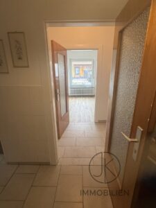 Die Küche schließt an das Wohnzimmer an und ist sowohl über den Flur als auch über eine Schiebetür vom Wohnzimmer aus zugänglich. Durch die Schiebetür kann der Raum flexibel geöffnet oder getrennt genutzt werden. Das modernisierte Badezimmer liegt angrenzend an die Küche und ist ausschließlich über diesen Bereich erreichbar.