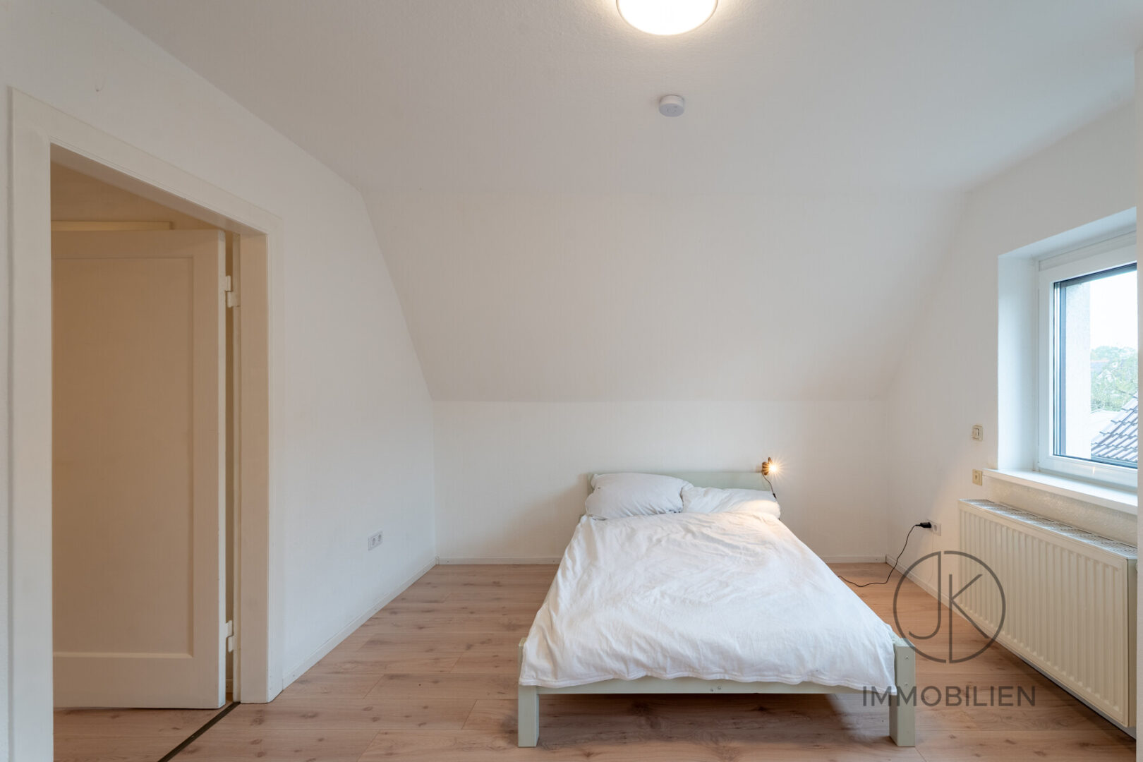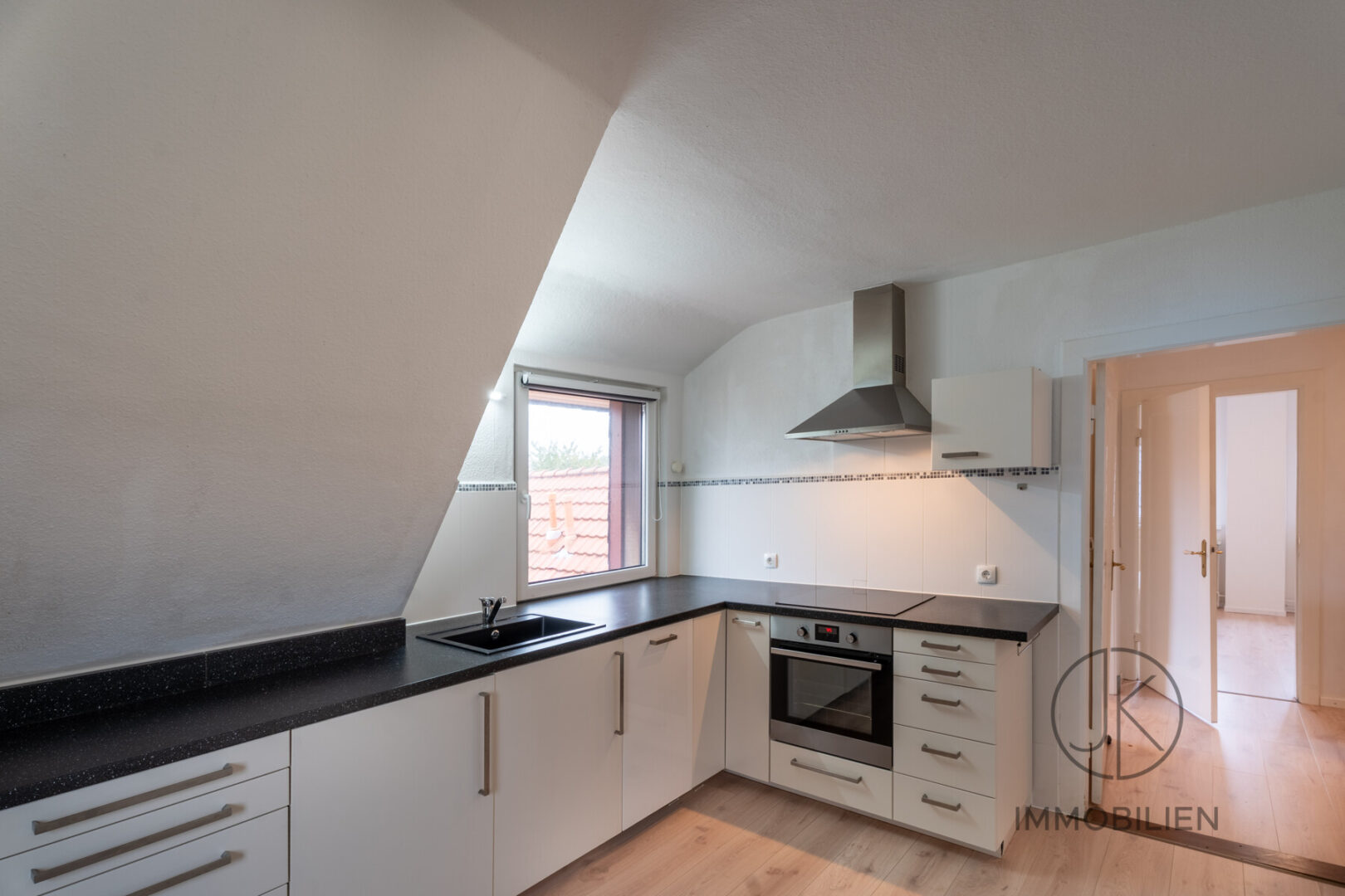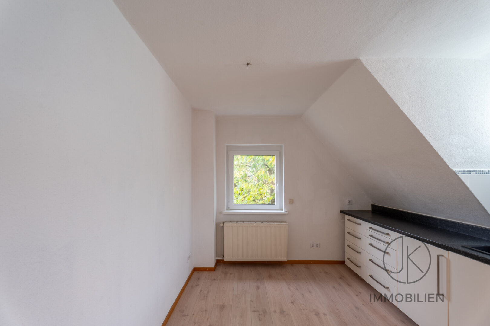 Die Dachgeschosswohnung besteht aus einem Wohnzimmer mit Zugang zum Balkon, einem Schlafzimmer, einer separaten Küche und einem Badezimmer. Auch diese Einheit ist vollständig eigenständig nutzbar und technisch klar getrennt ausgeführt.