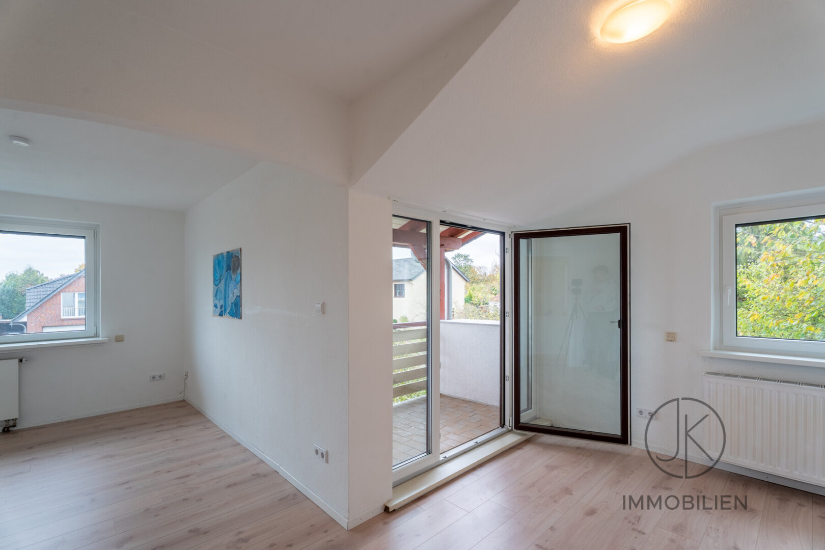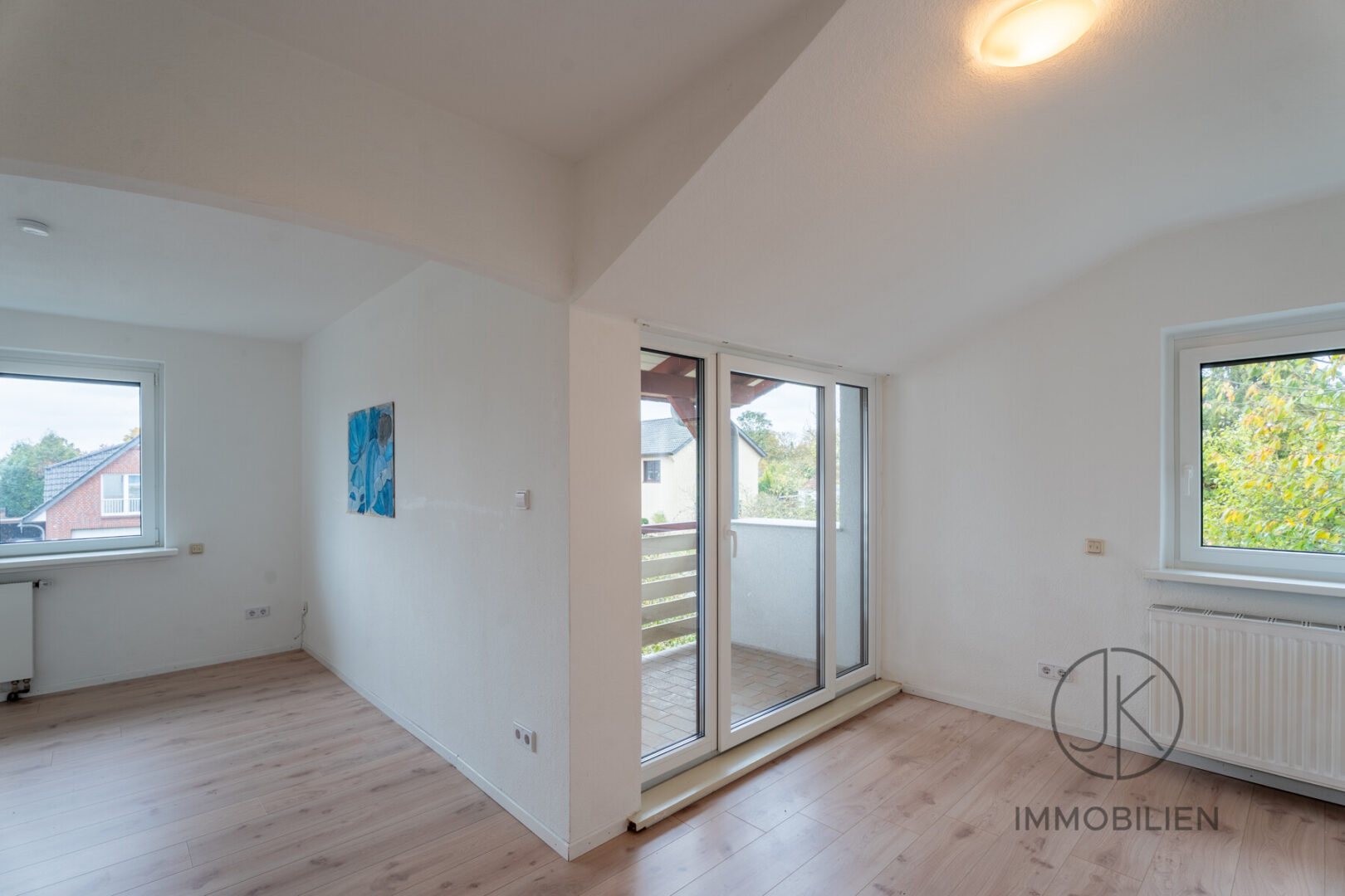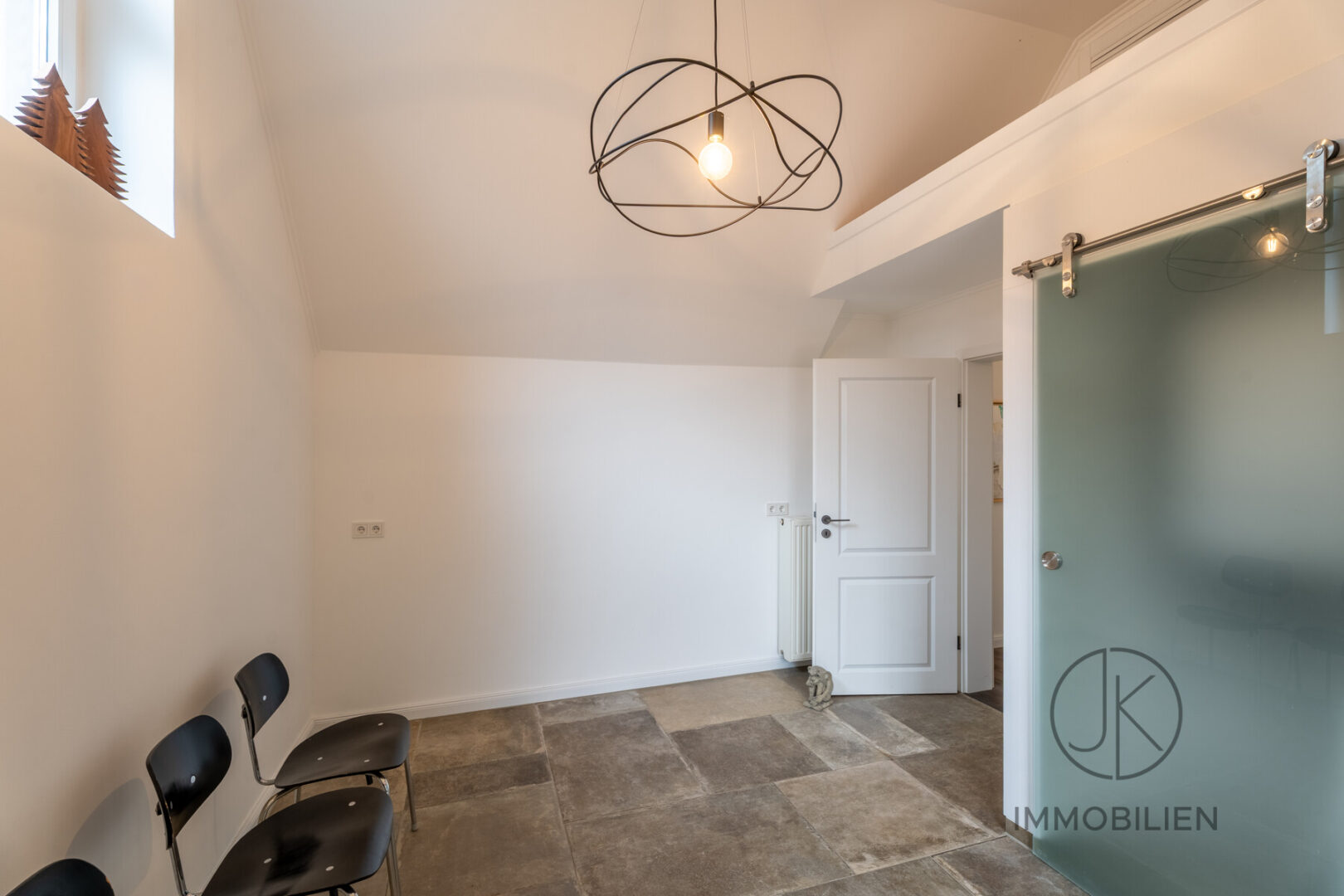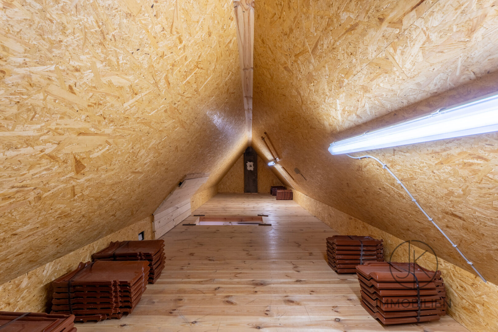 Die Dachgeschosswohnung besteht aus einem Wohnzimmer mit Zugang zum Balkon, einem Schlafzimmer, einer separaten Küche und einem Badezimmer. Auch diese Einheit ist vollständig eigenständig nutzbar und technisch klar getrennt ausgeführt.
