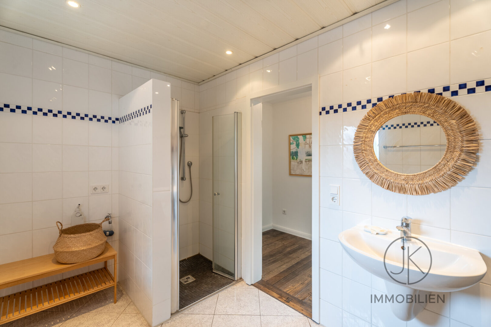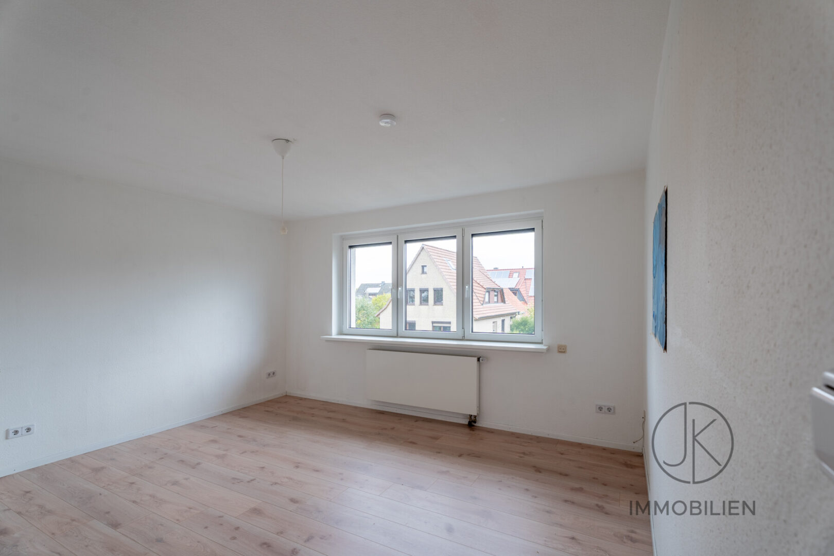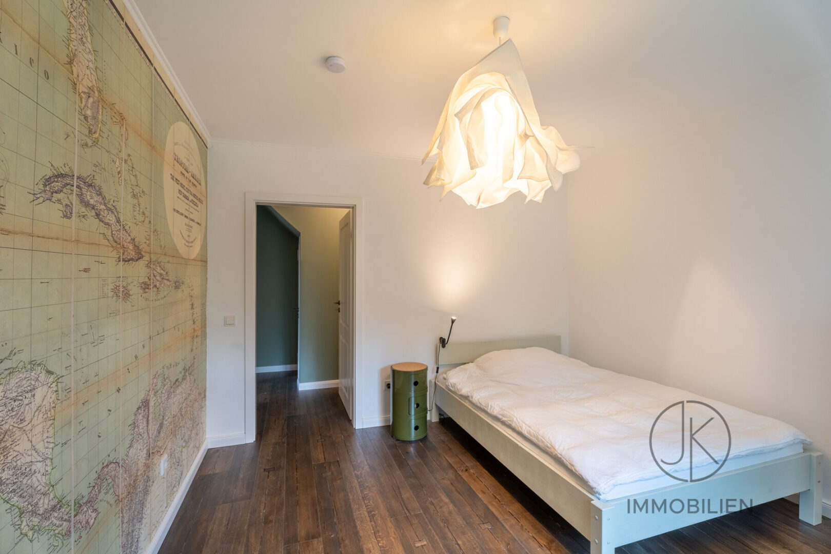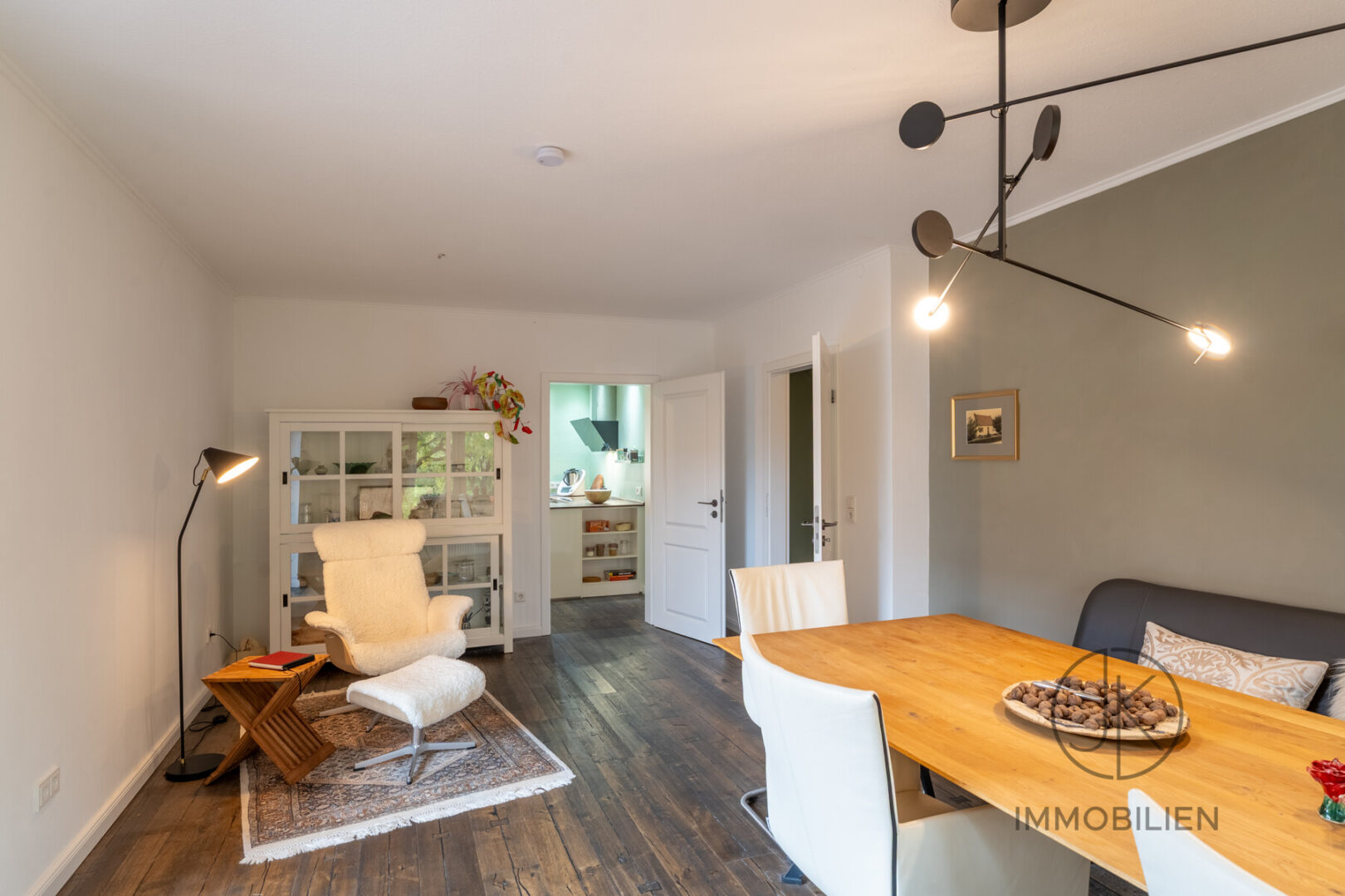 Die Erdgeschosswohnung umfasst drei Zimmer, ein Wohnzimmer und zwei Schlafzimmer, sowie eine separate Küche, ein Badezimmer und ein Gäste-WC. Ergänzt wird diese Einheit durch einen Teilkeller. In den letzten Jahren wurde das Erdgeschoss gezielt aufgewertet, unter anderem durch den Einbau einer neuen Küche, hochwertige Bodenbeläge sowie erneuerte Innentüren.