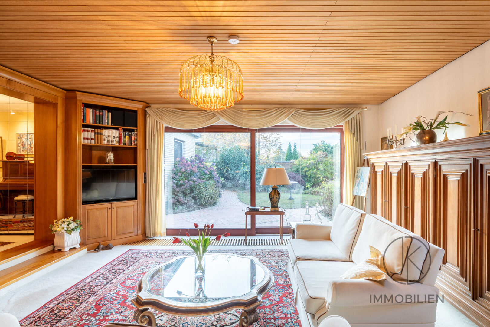 Der Anbau von 1981 bildet das architektonische Herz des Hauses. Die leicht abgesenkte Ebene, die bodentiefen Fensterflächen und die offene Verbindung zum Garten verleihen ihm eine intime, salonartige Stimmung. Er funktioniert als Bibliothek, Rückzugsort oder zweites Wohnzimmer und wird besonders in den Nachmittagsstunden von warmem Licht durchflutet. Eine Schiebetür öffnet den Raum zur Terrasse mit Blick auf den gestalteten Garten, den Teich und den kleinen Bachlauf.