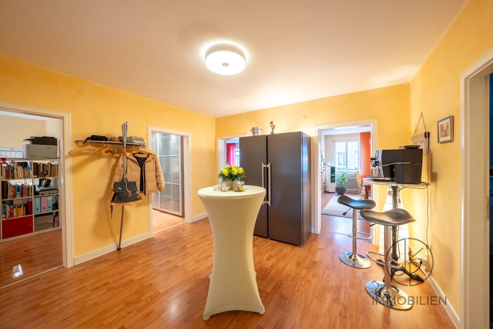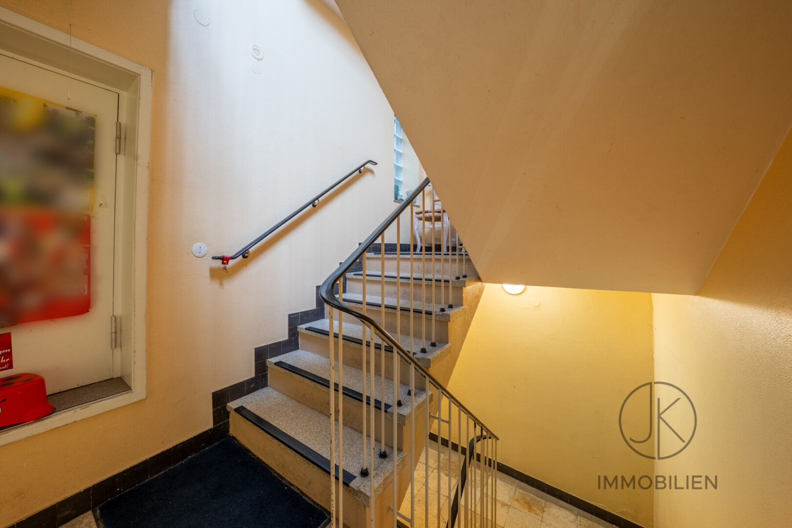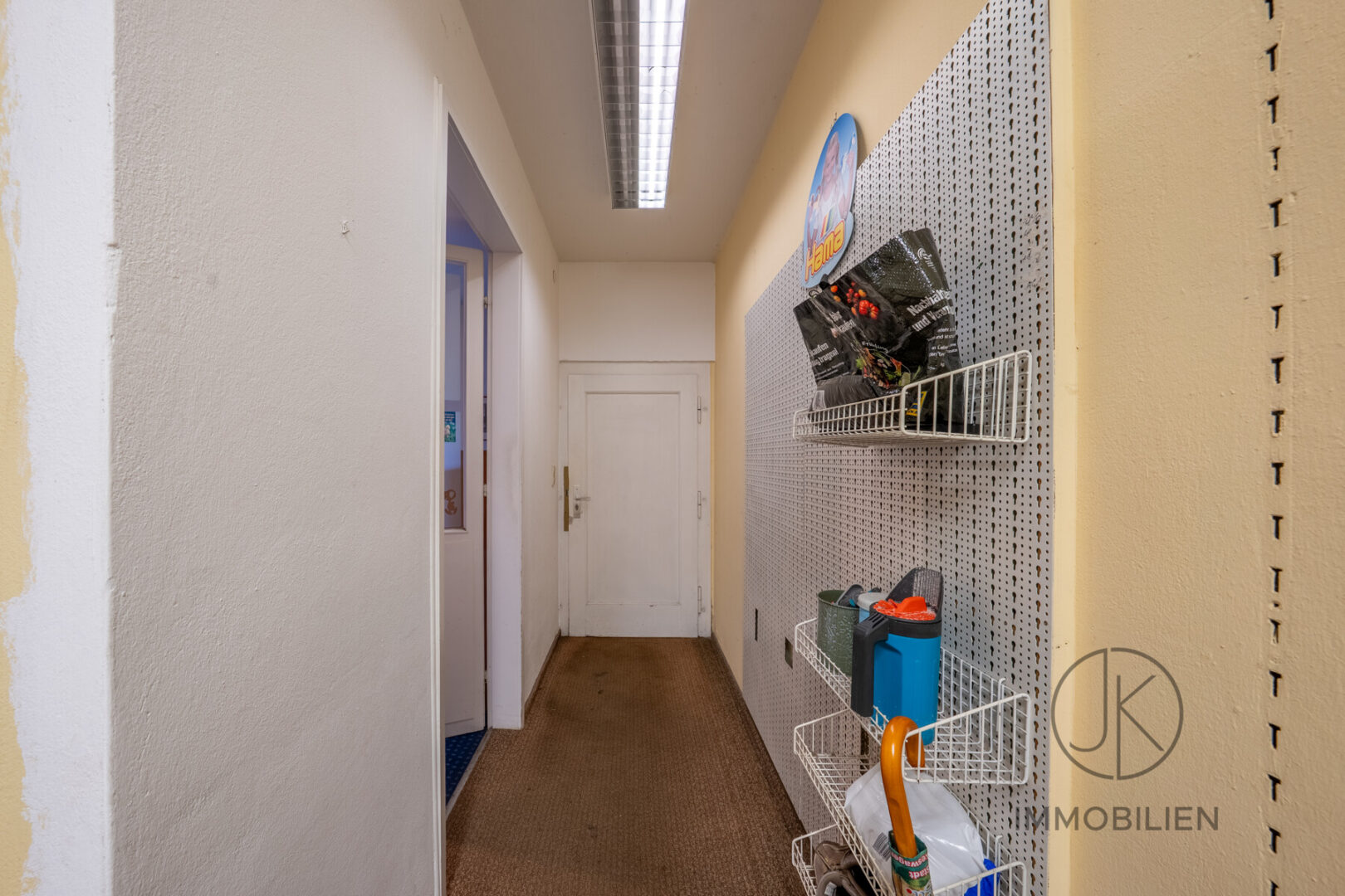 Eine Passage führt durch das Gebäude und verbindet den vorderen Geschäftsbereich mit den rückwärtigen Gebäudeteilen. Diese Struktur ist typisch für innerstädtische Geschäftshäuser und ermöglicht eine funktionale Trennung zwischen Verkaufsfläche, Arbeitsbereichen und Lagerflächen. Im hinteren Teil des Erdgeschosses stehen zusätzliche Nutz- und Lagerräume zur Verfügung, die den laufenden Betrieb optimal unterstützen und ausreichend Platz für Warenlagerung oder betriebliche Abläufe bieten.