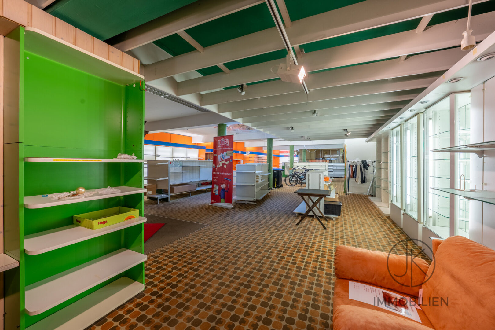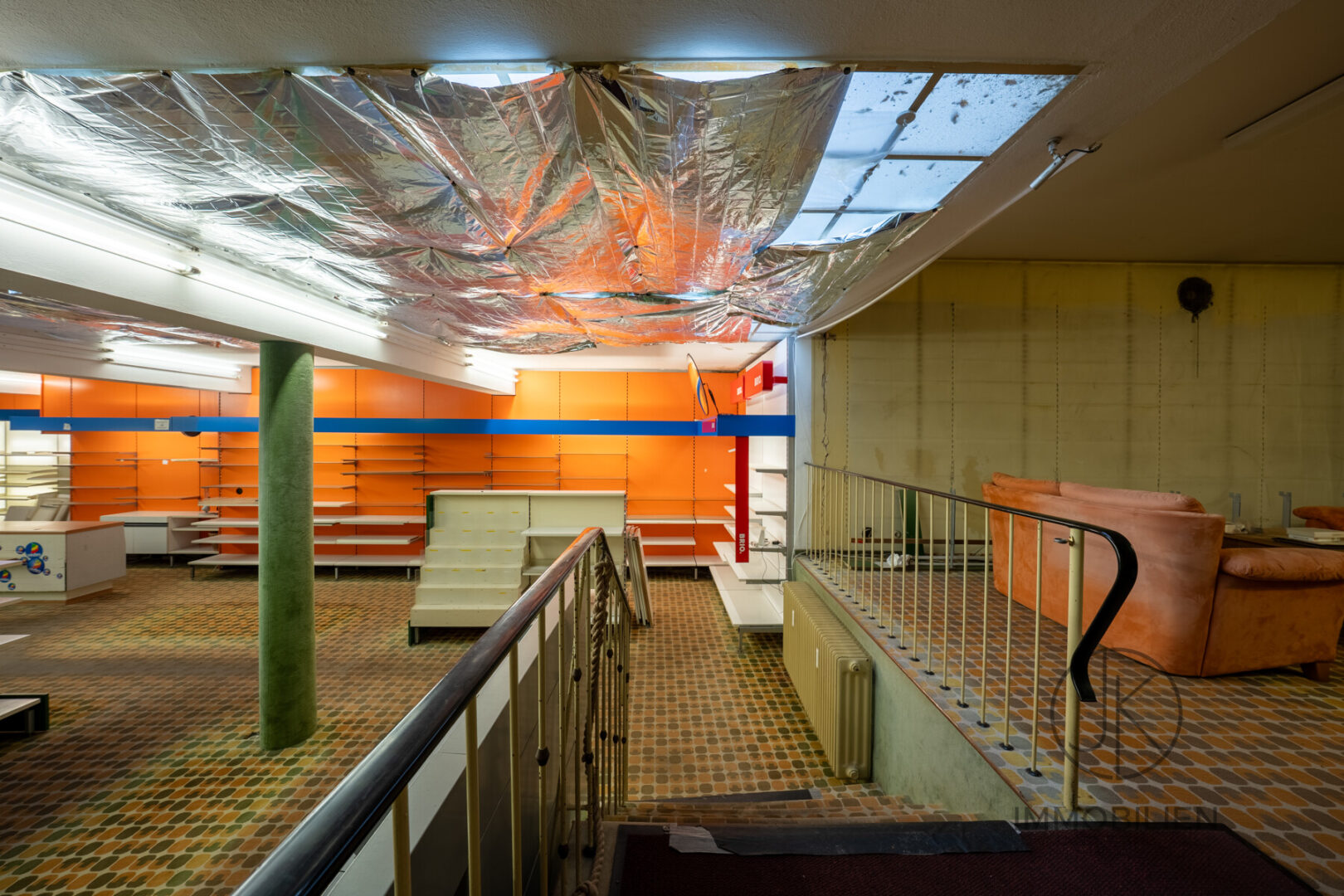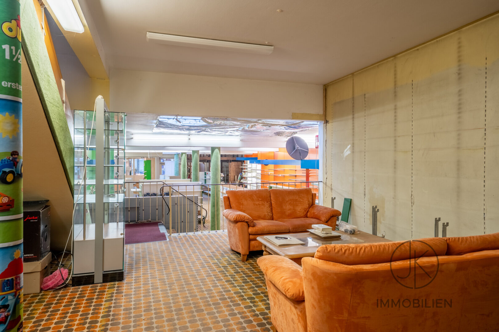 Im Erdgeschoss erstreckt sich eine großzügige Gewerbefläche, die sich über mehrere Bereiche gliedert und eine klare funktionale Struktur erkennen lässt. Zur Straßenseite hin befindet sich der Hauptverkaufsbereich mit weitläufiger Schaufensterfront, die eine attraktive Präsentation von Waren oder Dienstleistungen ermöglicht. Dahinter schließen sich weitere Verkaufs- und Nebenflächen an, die flexibel genutzt werden können und eine angenehme Großzügigkeit im Raumgefühl vermitteln. Ergänzt wird diese Ebene durch ein separates Büro, das sich ideal für organisatorische Tätigkeiten oder Beratungsgespräche eignet.