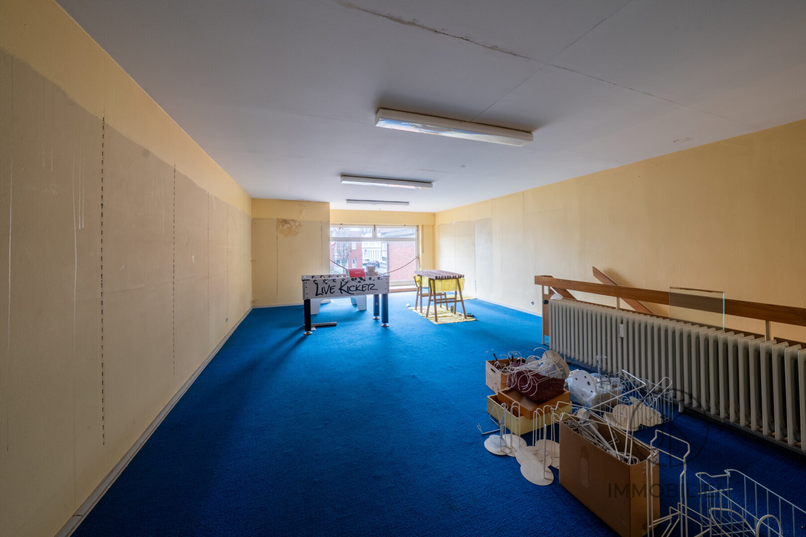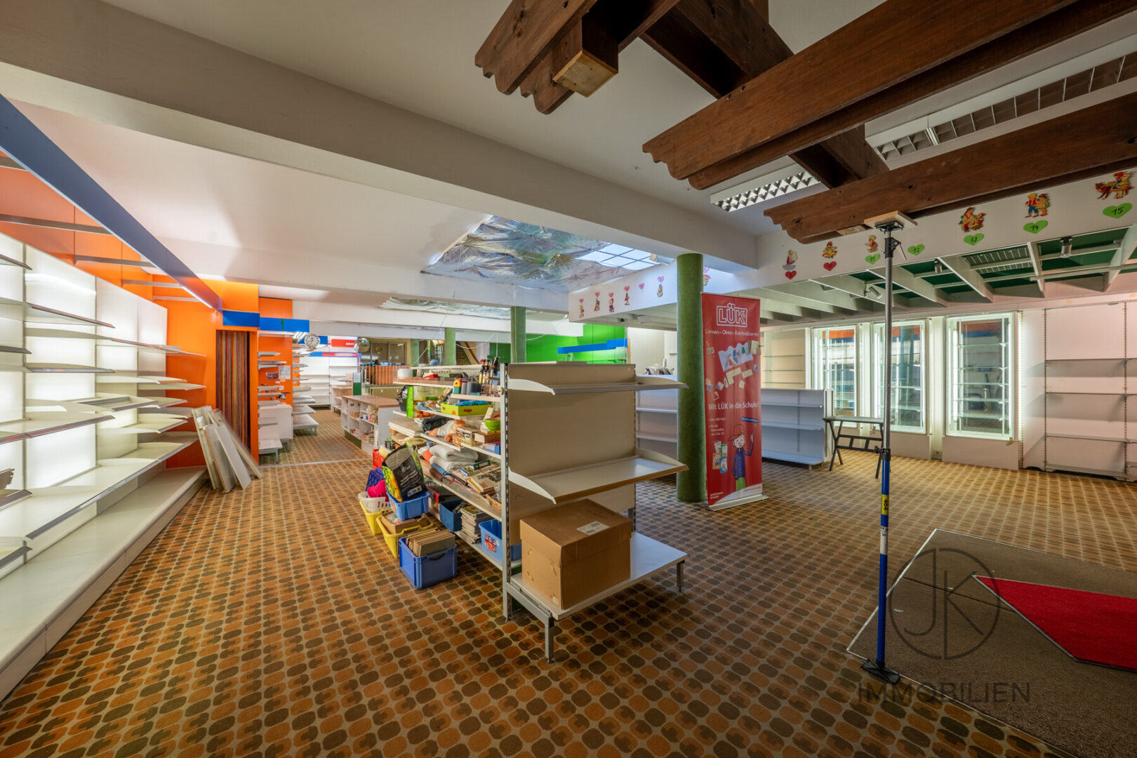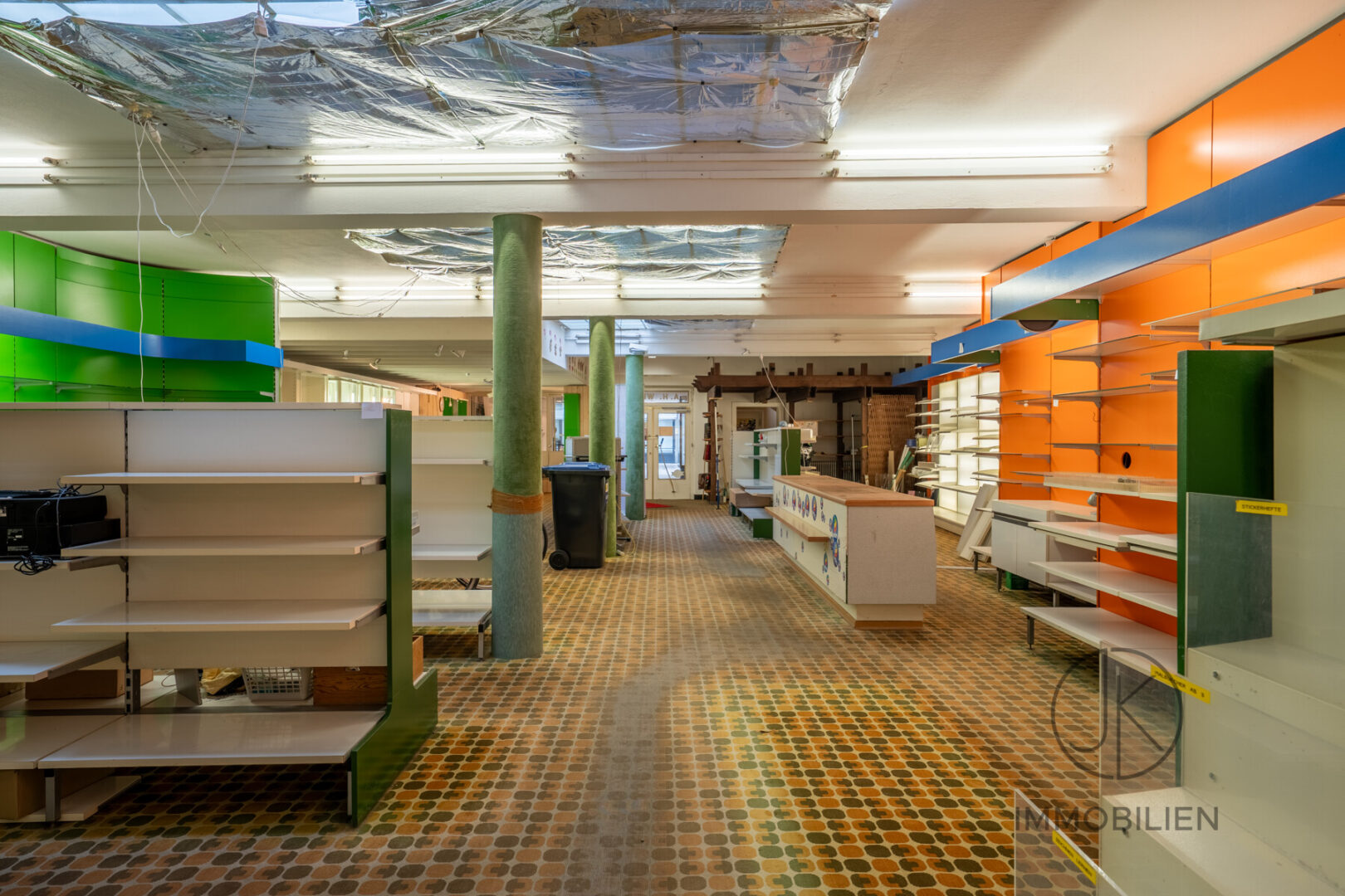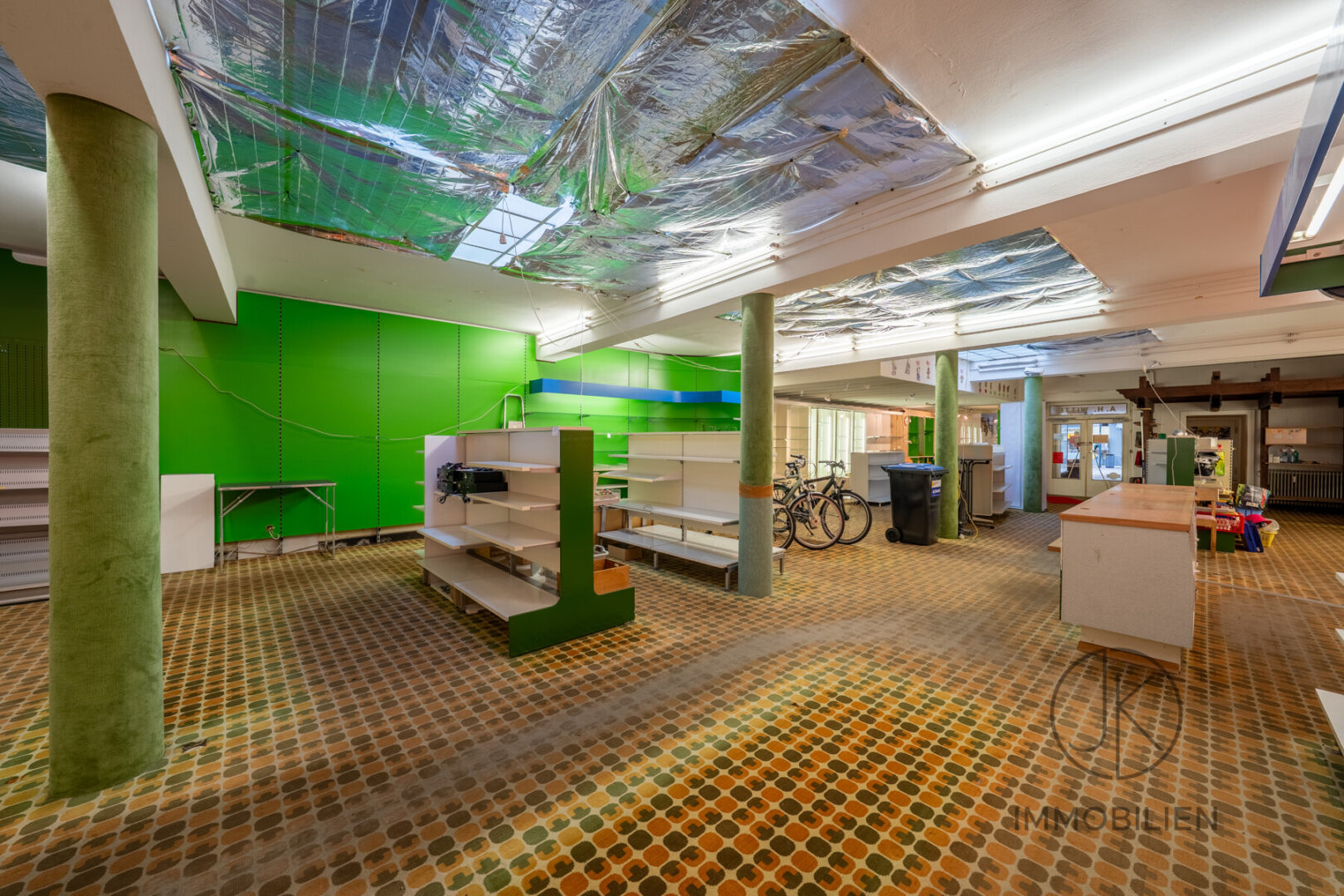 Im Erdgeschoss erstreckt sich eine großzügige Gewerbefläche, die sich über mehrere Bereiche gliedert und eine klare funktionale Struktur erkennen lässt. Zur Straßenseite hin befindet sich der Hauptverkaufsbereich mit weitläufiger Schaufensterfront, die eine attraktive Präsentation von Waren oder Dienstleistungen ermöglicht. Dahinter schließen sich weitere Verkaufs- und Nebenflächen an, die flexibel genutzt werden können und eine angenehme Großzügigkeit im Raumgefühl vermitteln. Ergänzt wird diese Ebene durch ein separates Büro, das sich ideal für organisatorische Tätigkeiten oder Beratungsgespräche eignet.